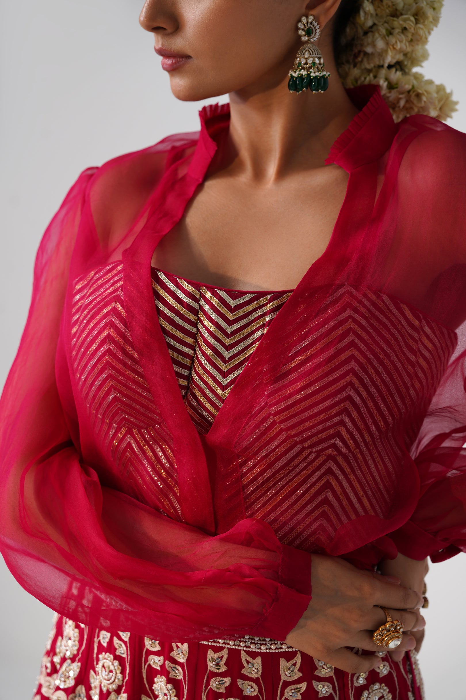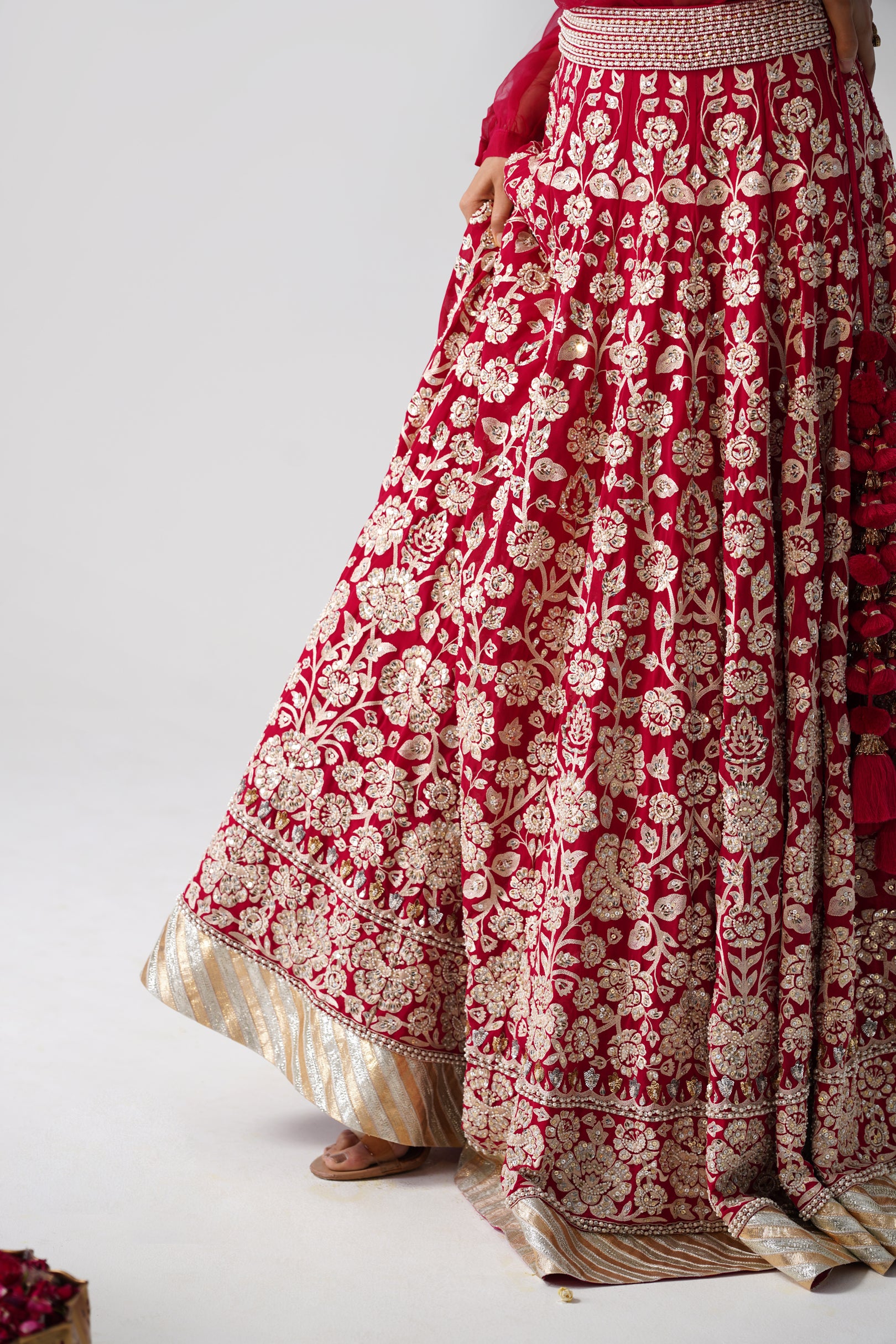 Featuring a pink lehenga in georgette base with aari resham, pearls, sequins and swarovski crystal embroidery, including tassel detail. It is paired with a chanderi corset having gota work and a silk organza shirt. Accentuate it with statement earrings and embellished heels for a modern regal look, perfect for weddings, receptions and festive evening celebrations.