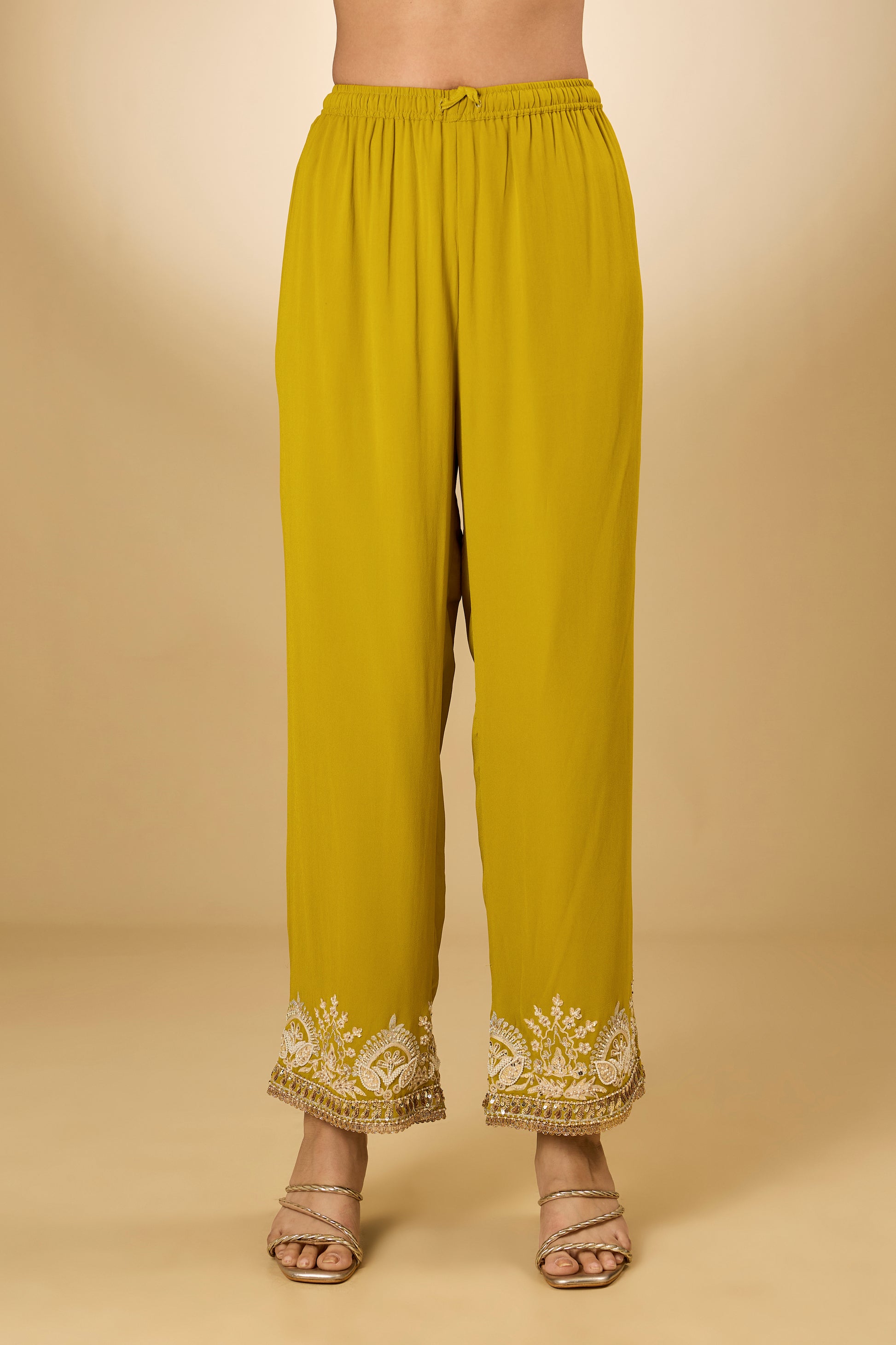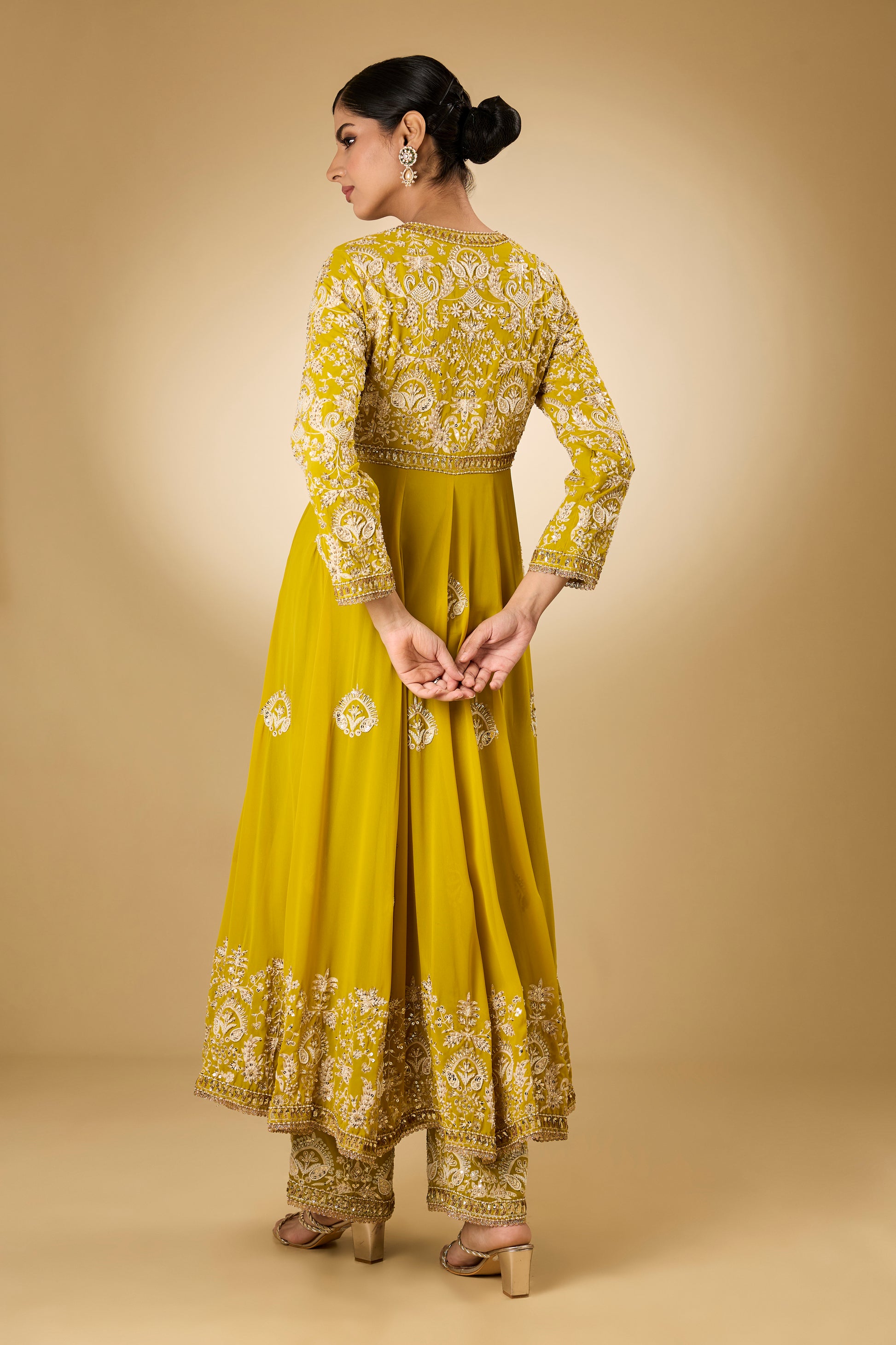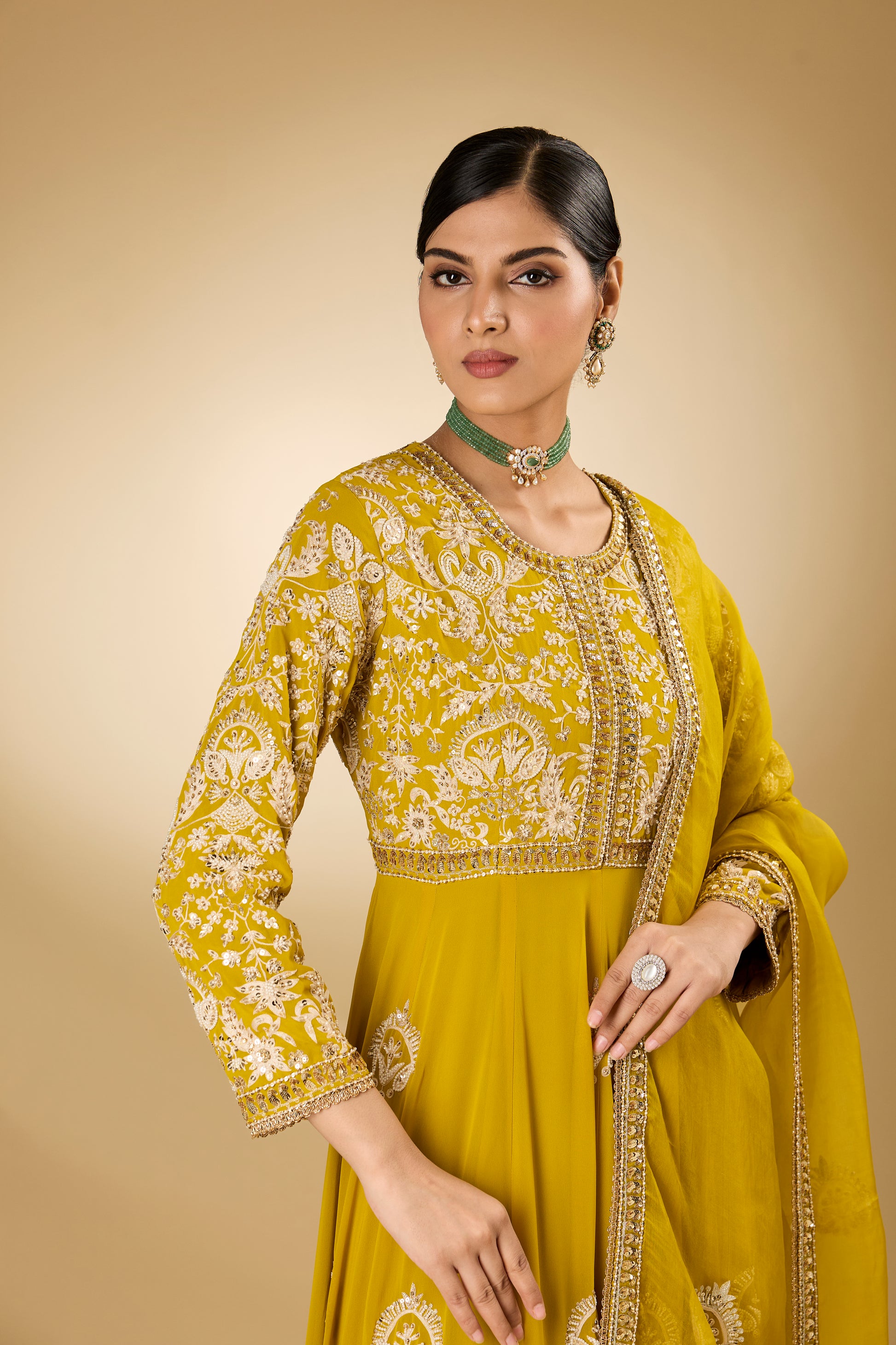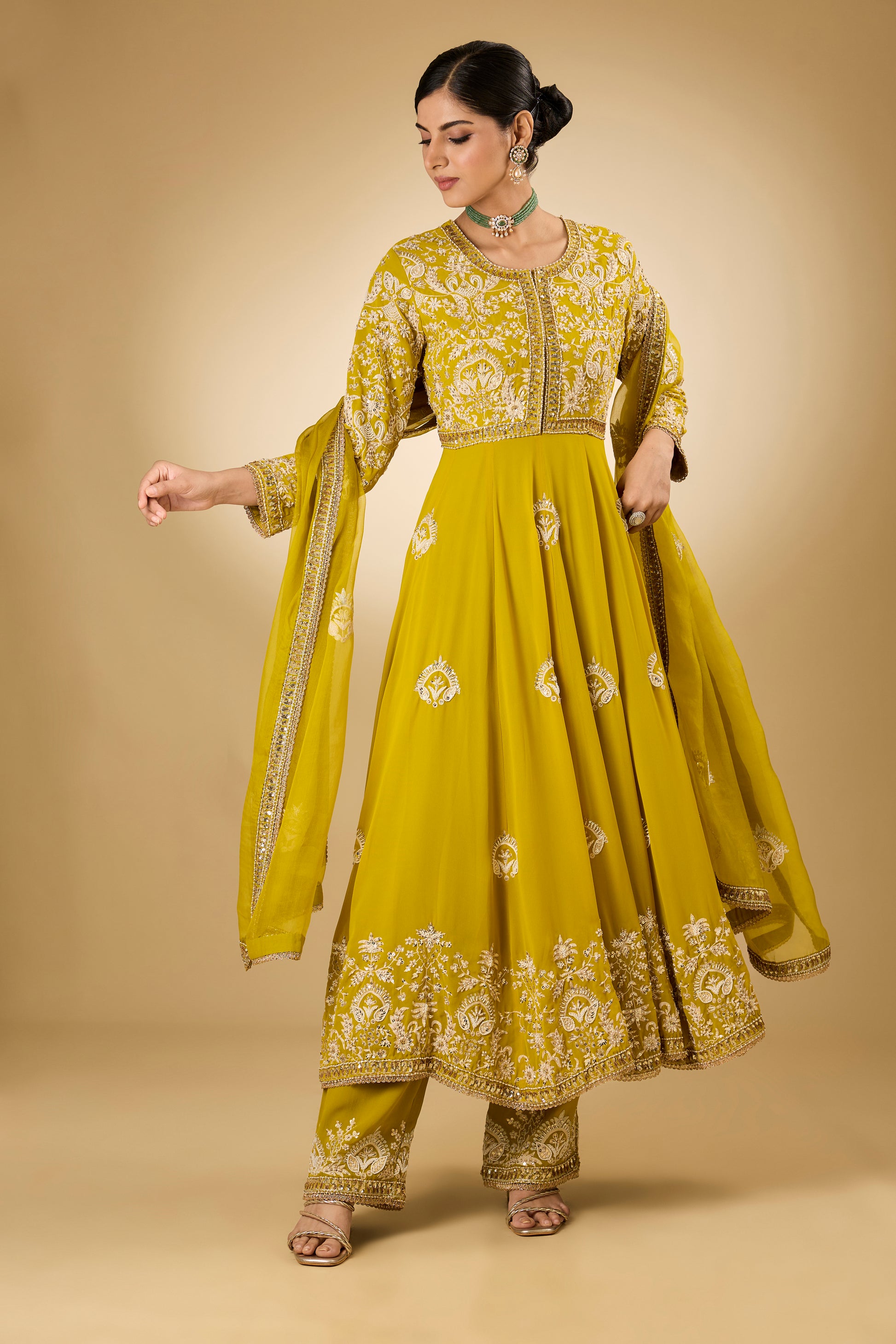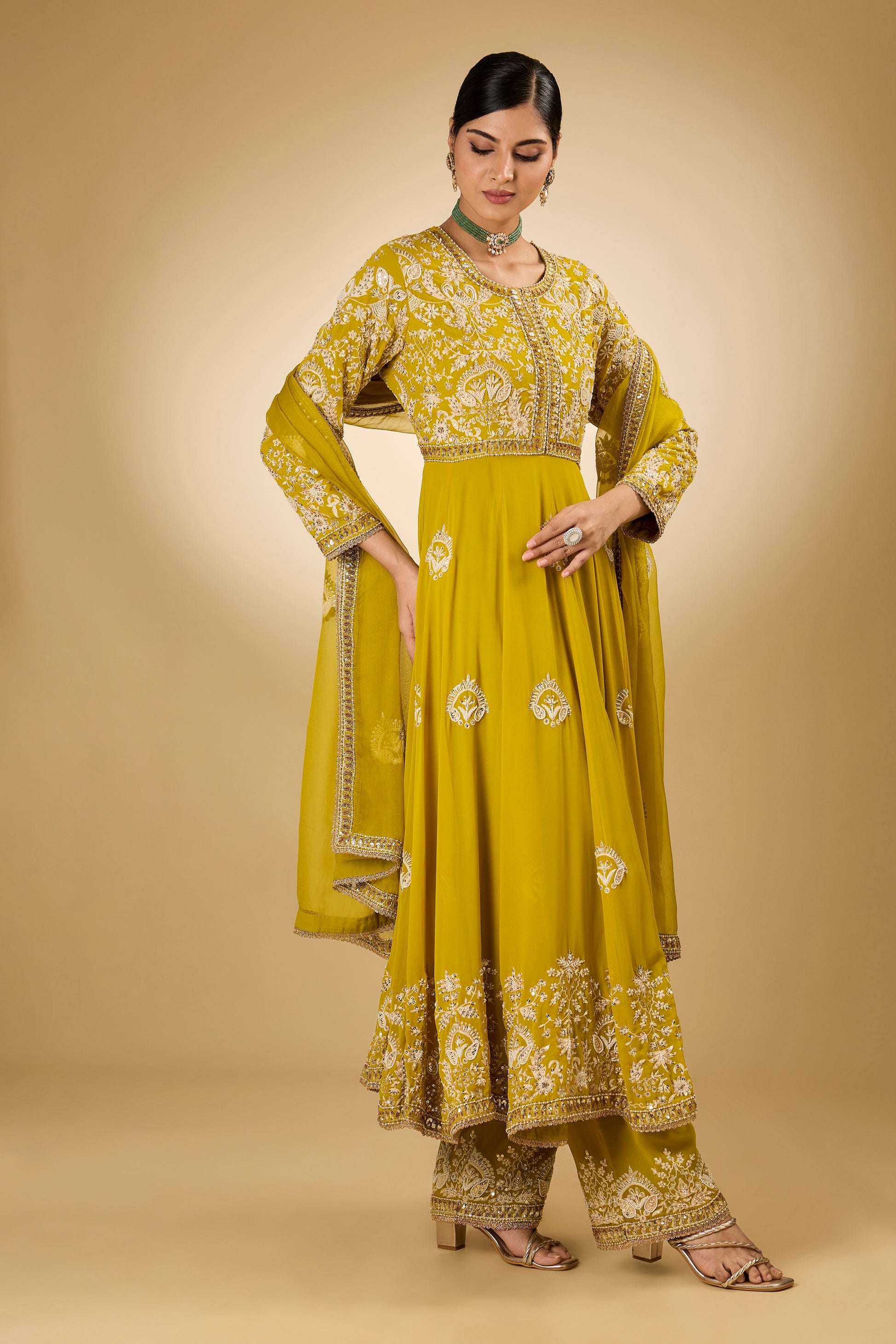 Featuring a yellow anarkali in georgette base with aari resham, pearls, sequins and swarovski crystal embroidery. It is paired with modal satin pants and a silk organza dupatta. Accentuate it with delicate jewellery and embellished juttis for an elegant touch, perfect for festive gatherings, haldi functions and evening celebrations.