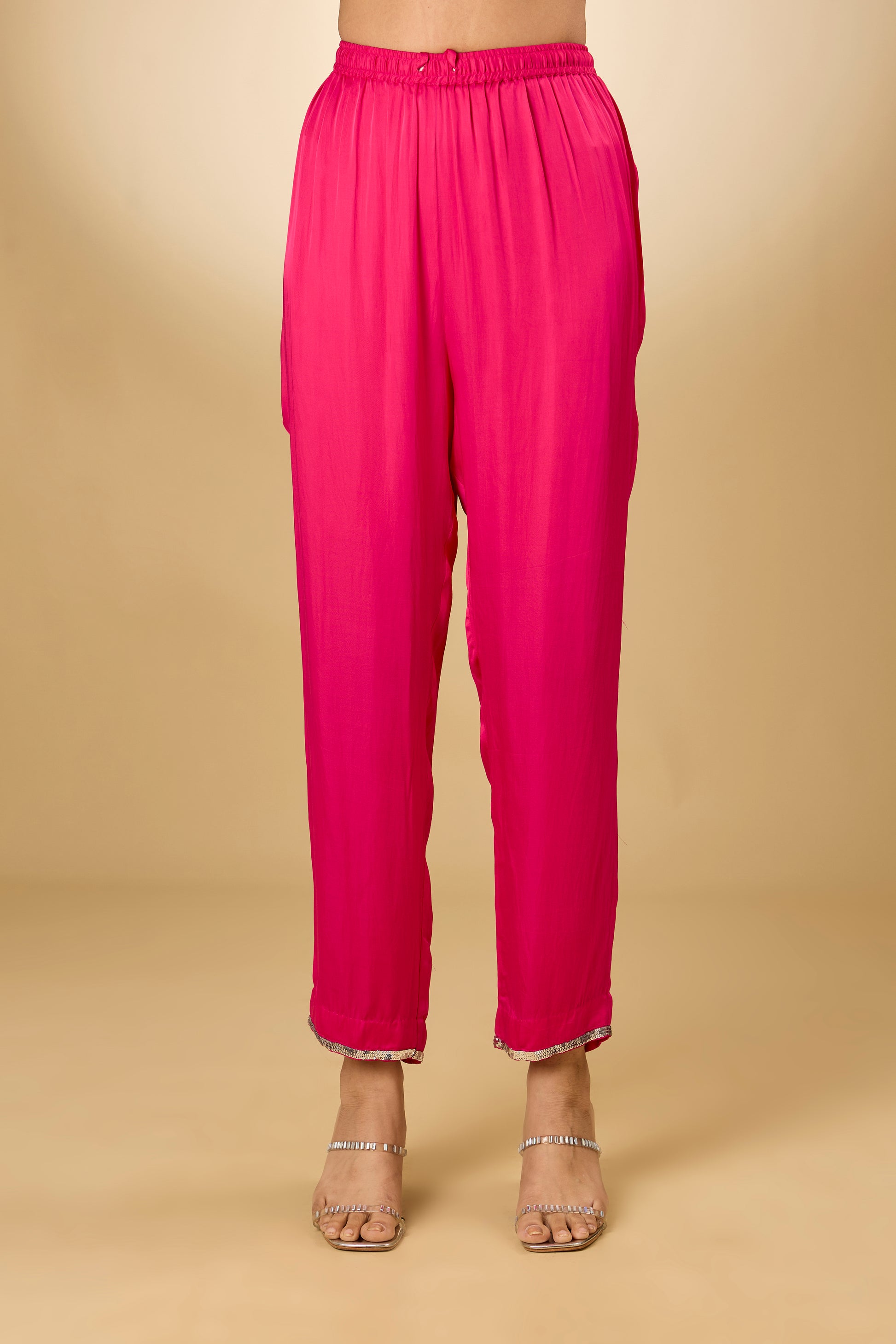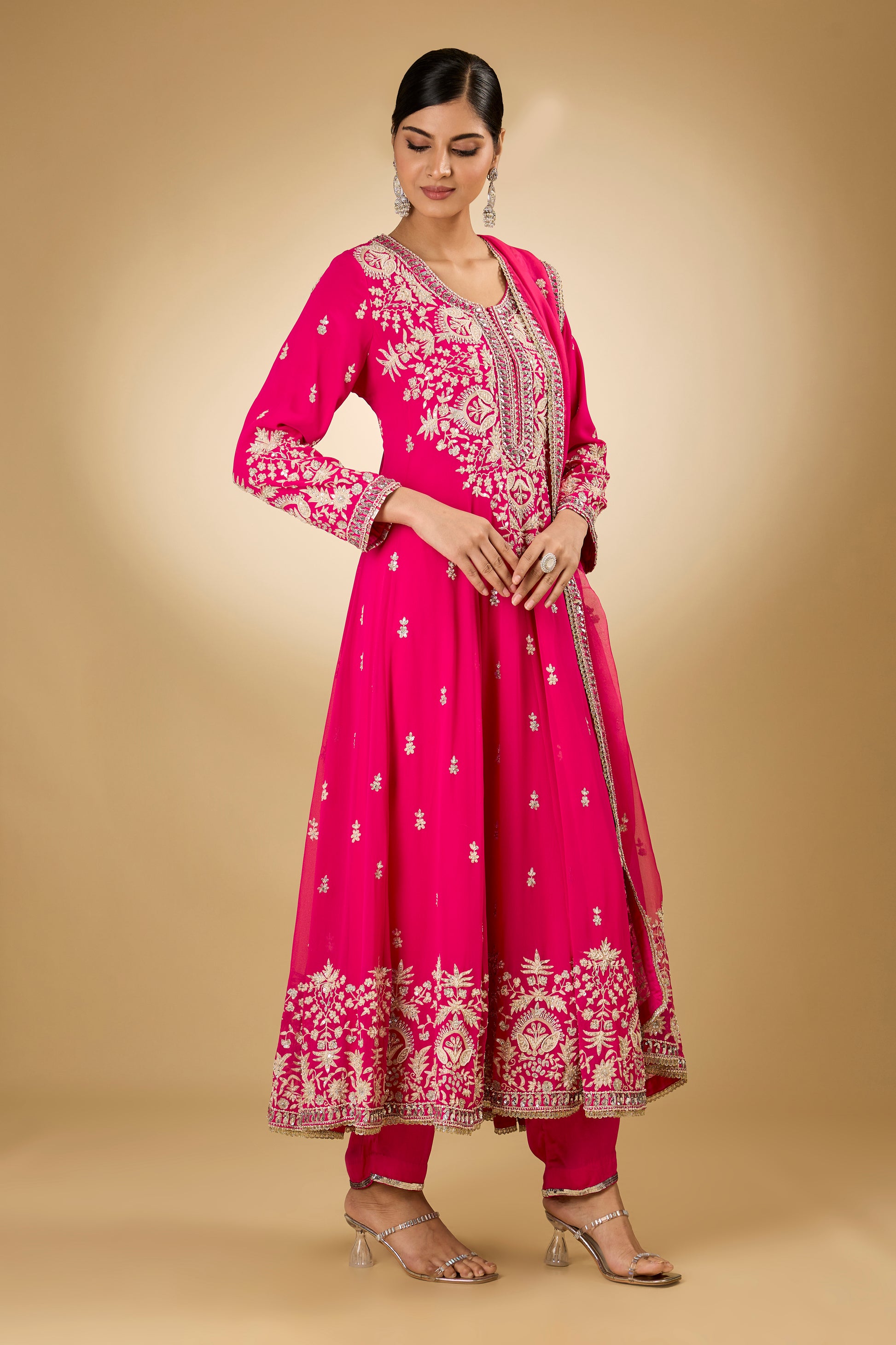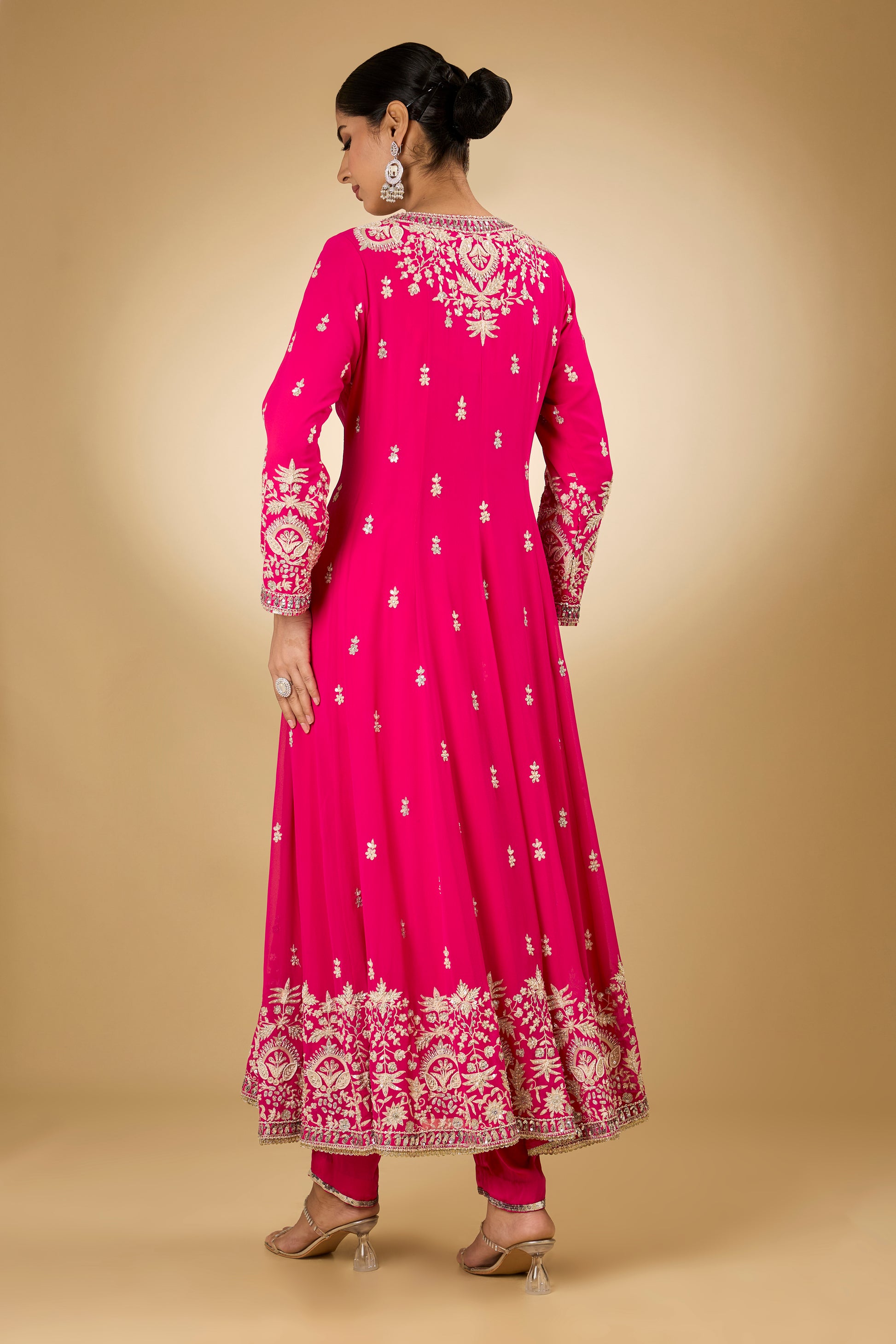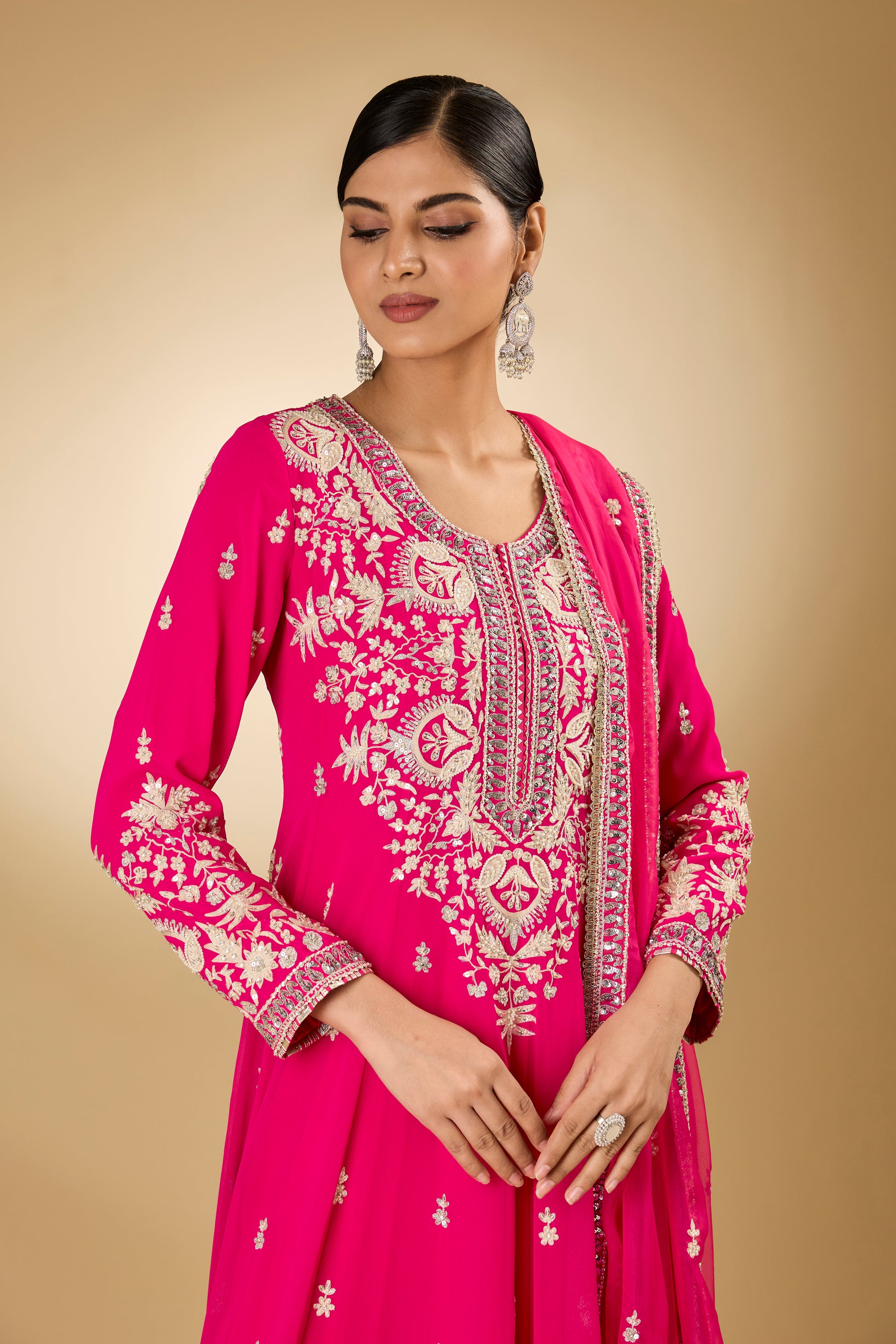 Featuring a pink anarkali in georgette base with aari resham, pearls, sequins and swarovski crystal embroidery. It is paired with modal satin pants and a silk organza dupatta. Accentuate it with chandbalis and embellished heels for a regal charm, perfect for weddings, festive celebrations and grand traditional occasions.