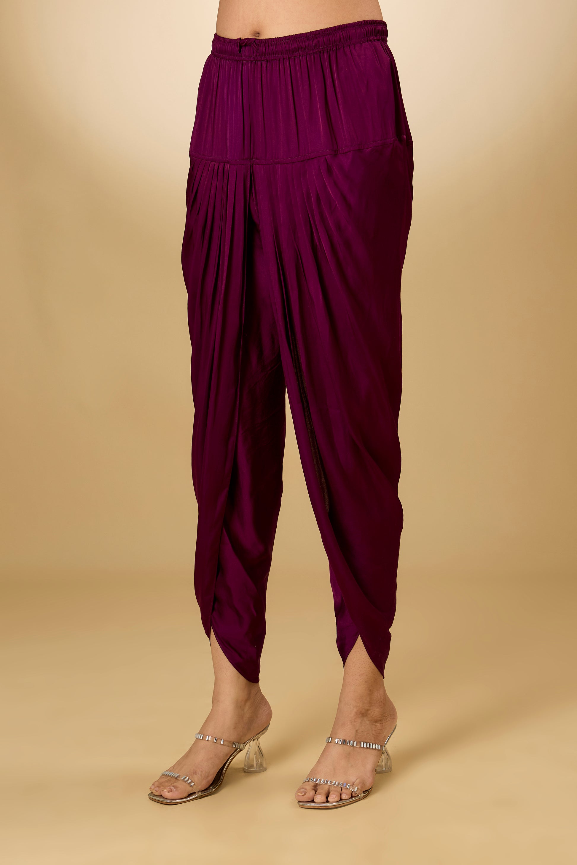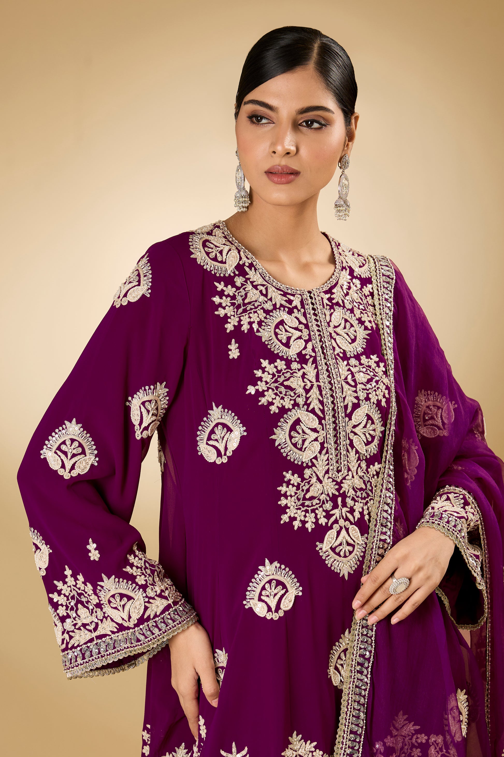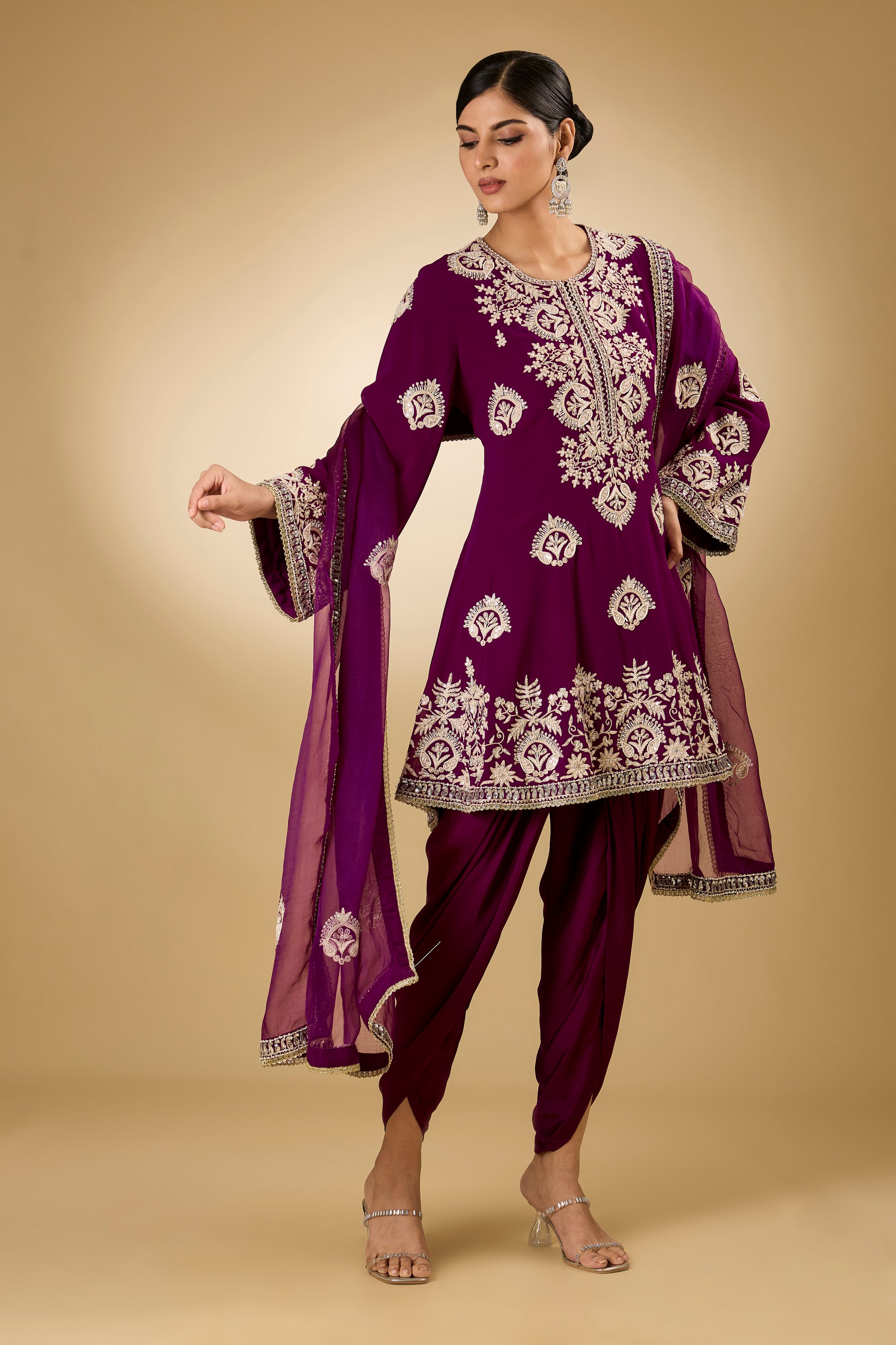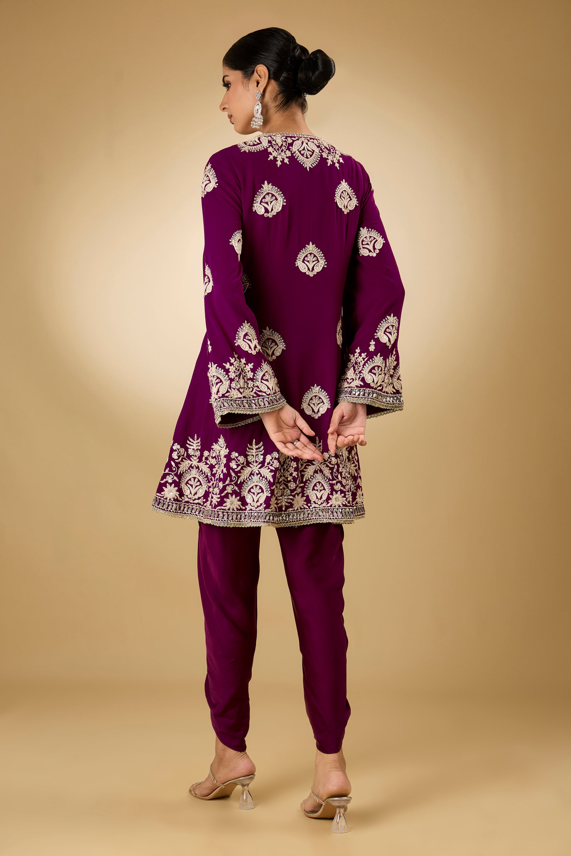 Featuring a purple short anarkali in georgette base with aari resham, pearls, sequins and swarovski crystal embroidery. It is paired with modal satin tulip pants and a silk organza dupatta. Accentuate it with delicate jewellery and embellished juttis for an elegant touch, perfect for festive gatherings, weddings and evening celebrations.
