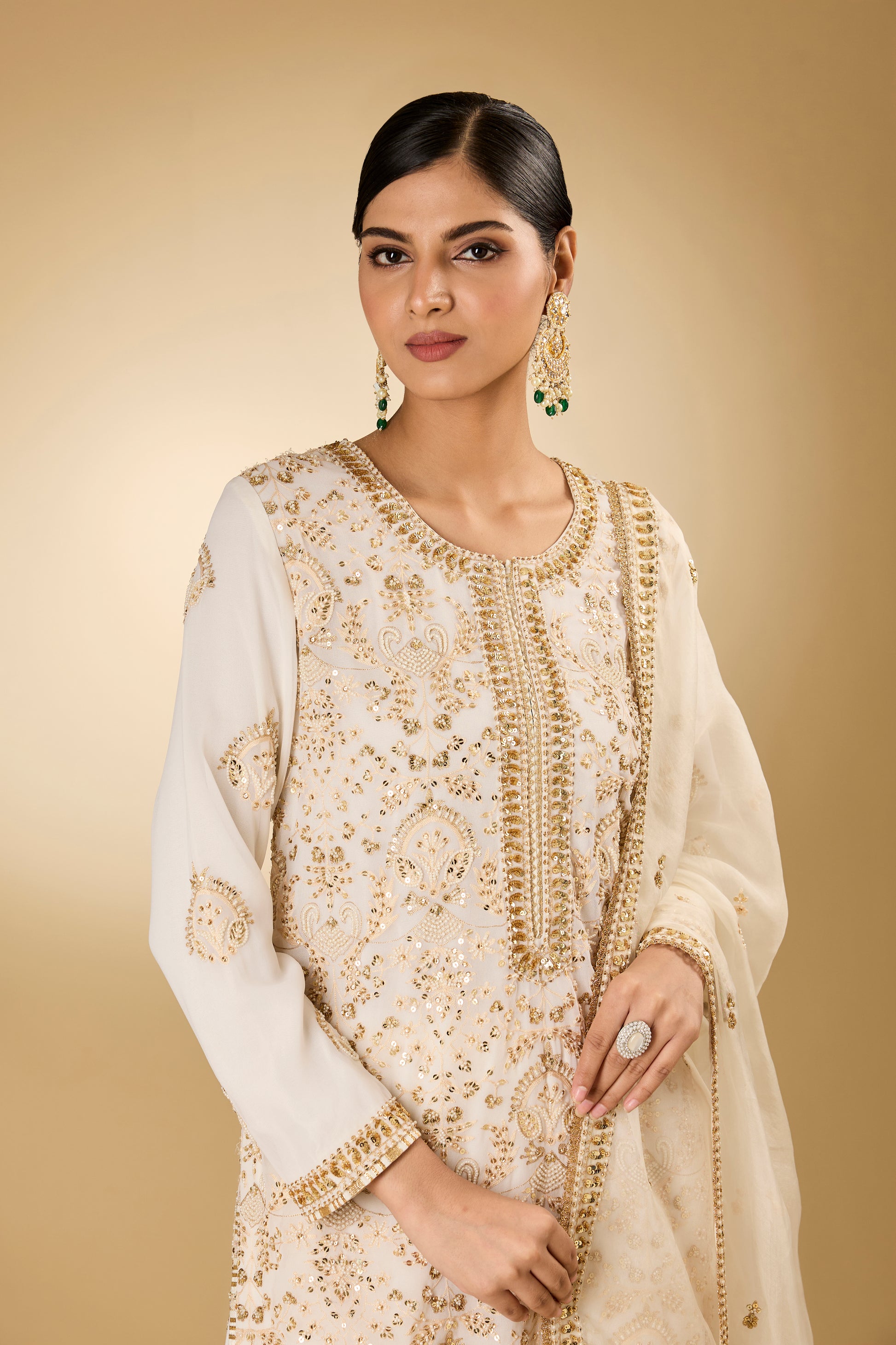 Featuring an off-white kurta in georgette base with aari resham, pearls, sequins and swarovski crystal embroidery. It is paired with gharara pants and a silk organza dupatta. Accentuate it with pearl jhumkas and embellished juttis for an elegant traditional look, perfect for weddings, festive gatherings and cultural celebrations.