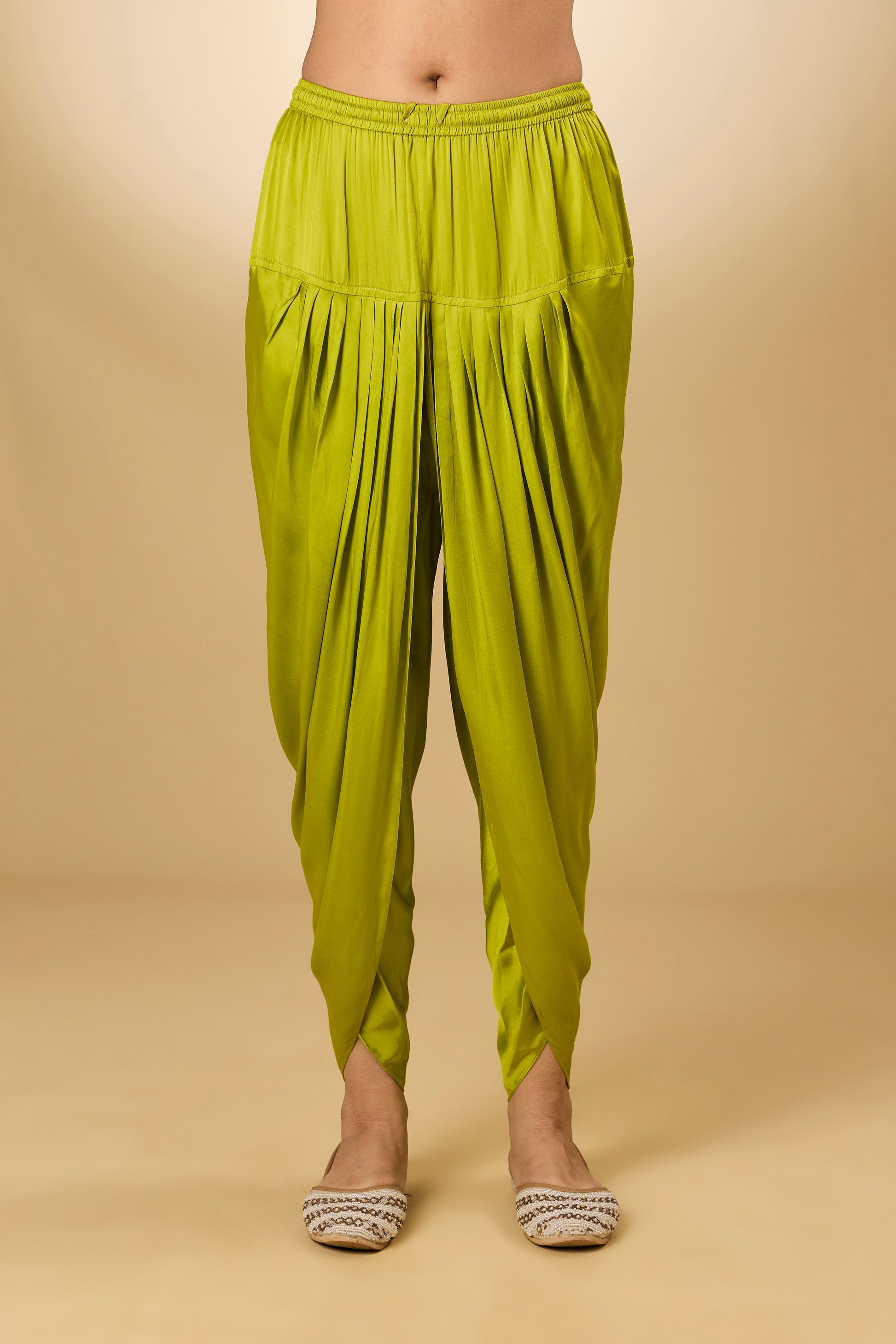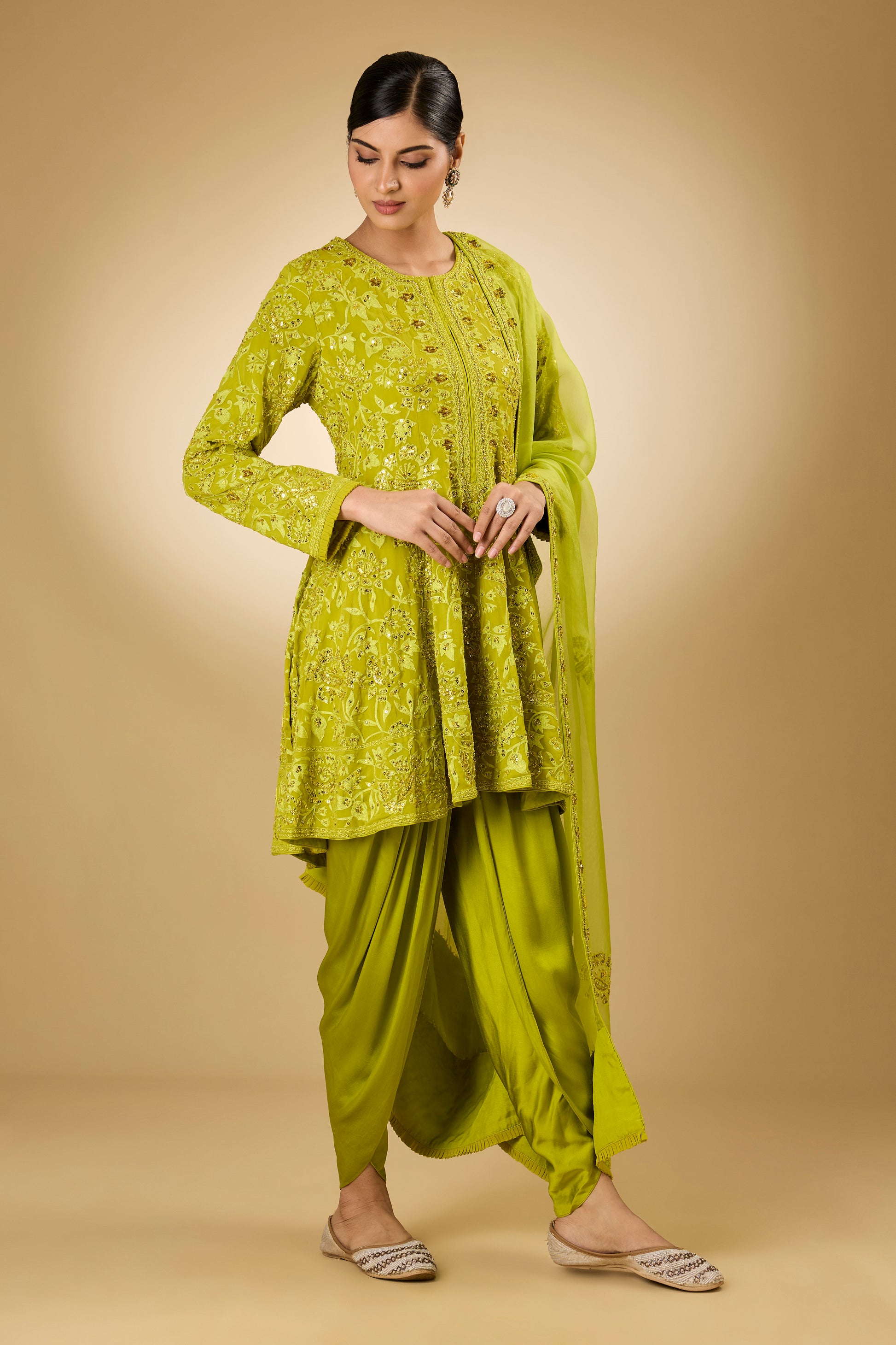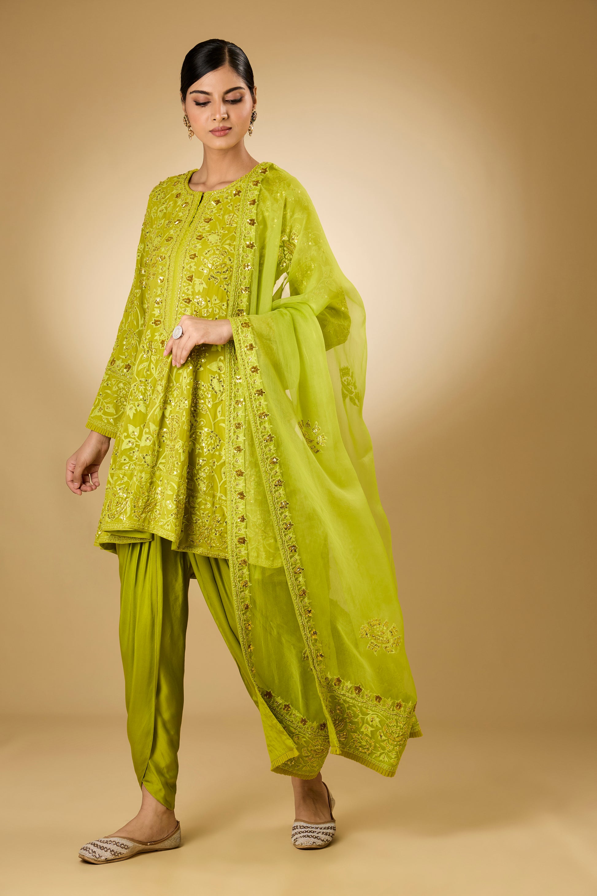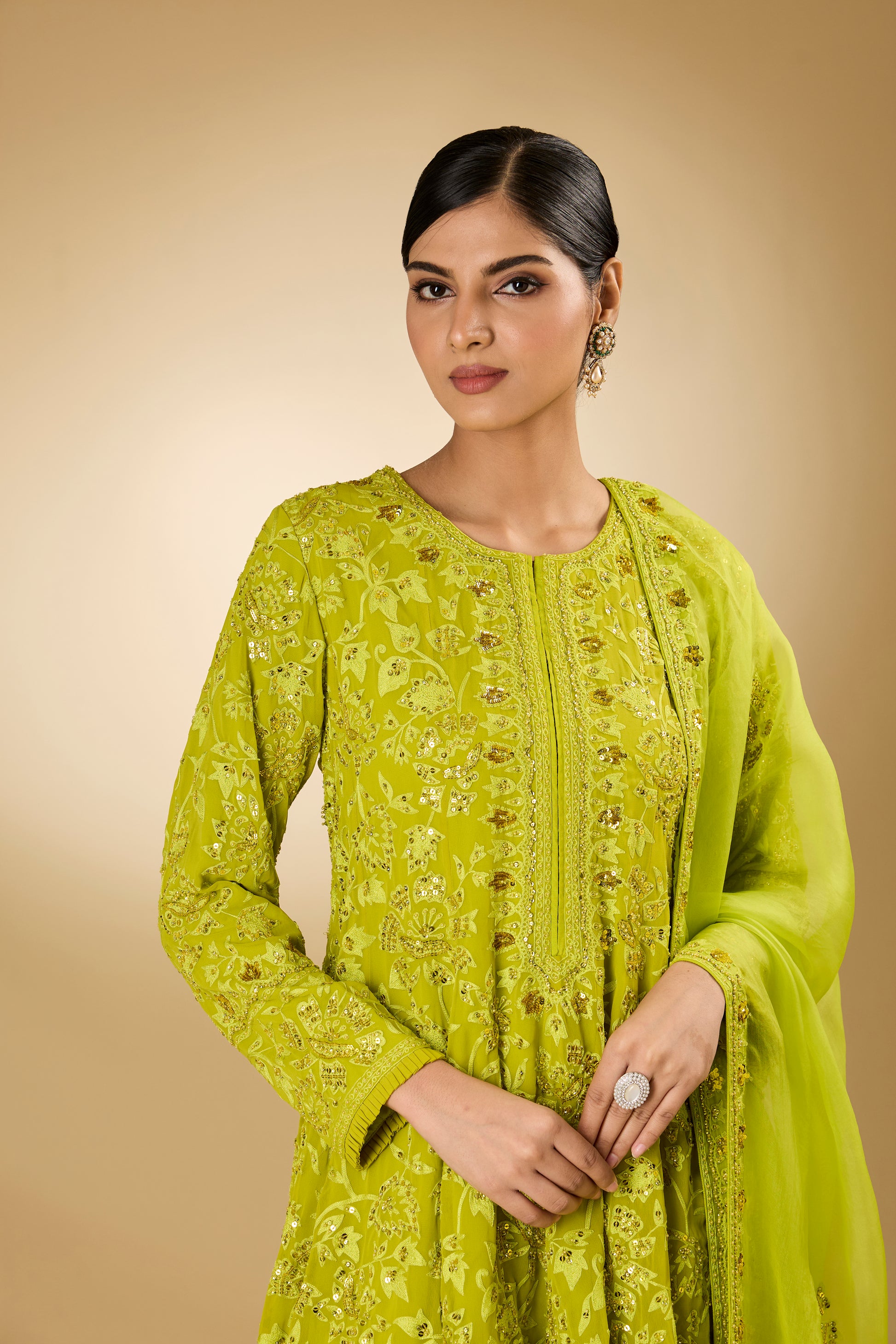 Featuring a parrot green anarkali in georgette base with aari resham, pearls, sequins and swarovski crystal embroidery. It is paired with modal satin tulip pants and a silk organza dupatta. Accentuate it with delicate jewellery and embellished juttis for an elegant touch, perfect for festive gatherings, weddings and evening celebrations.